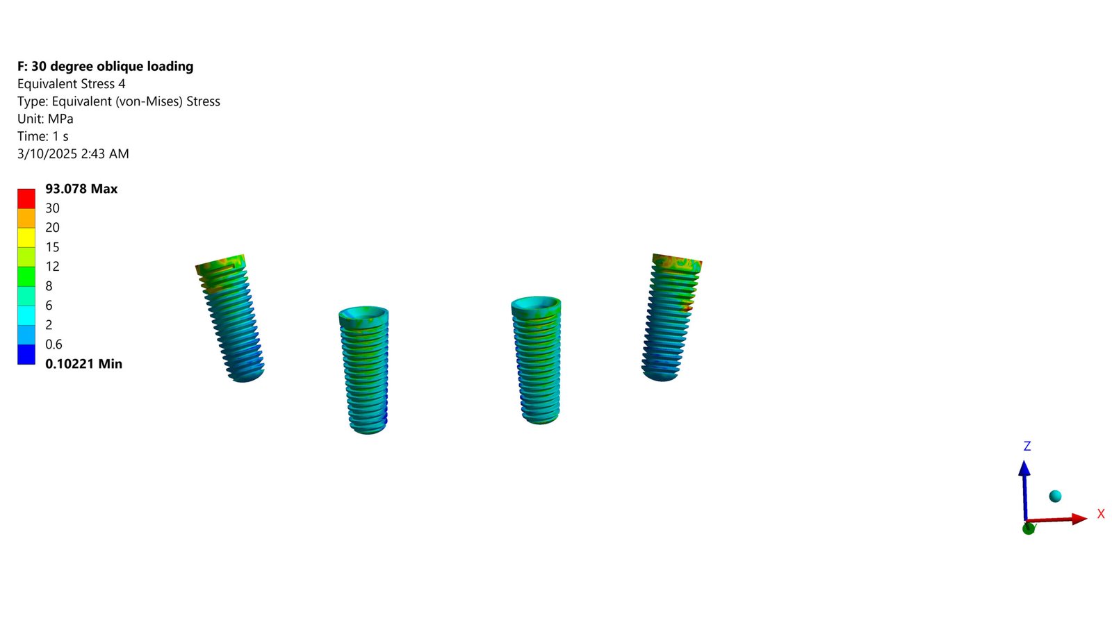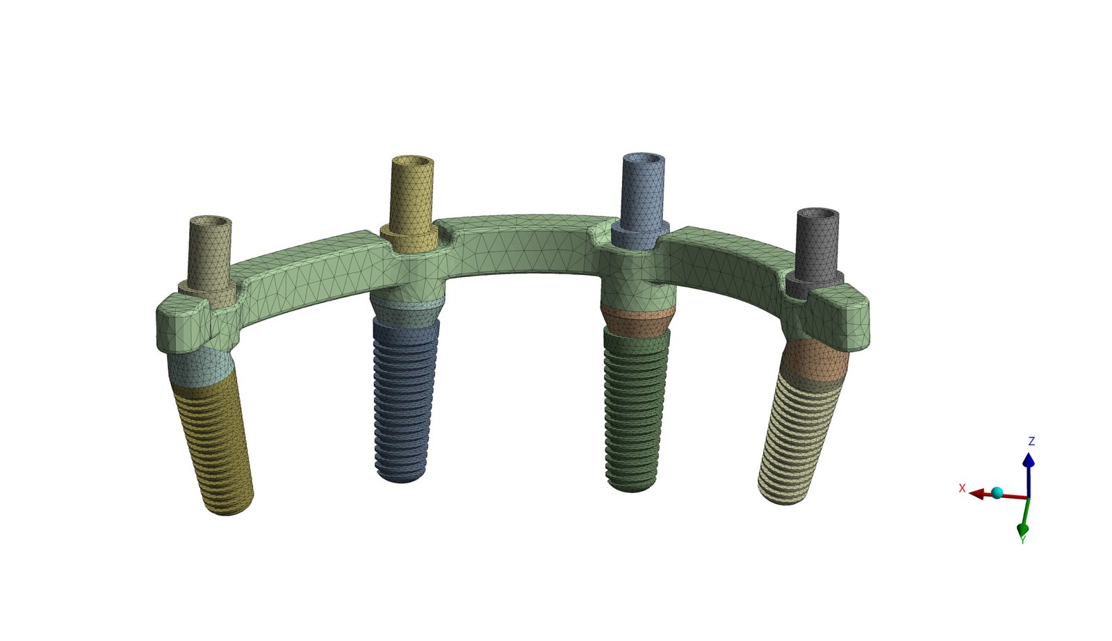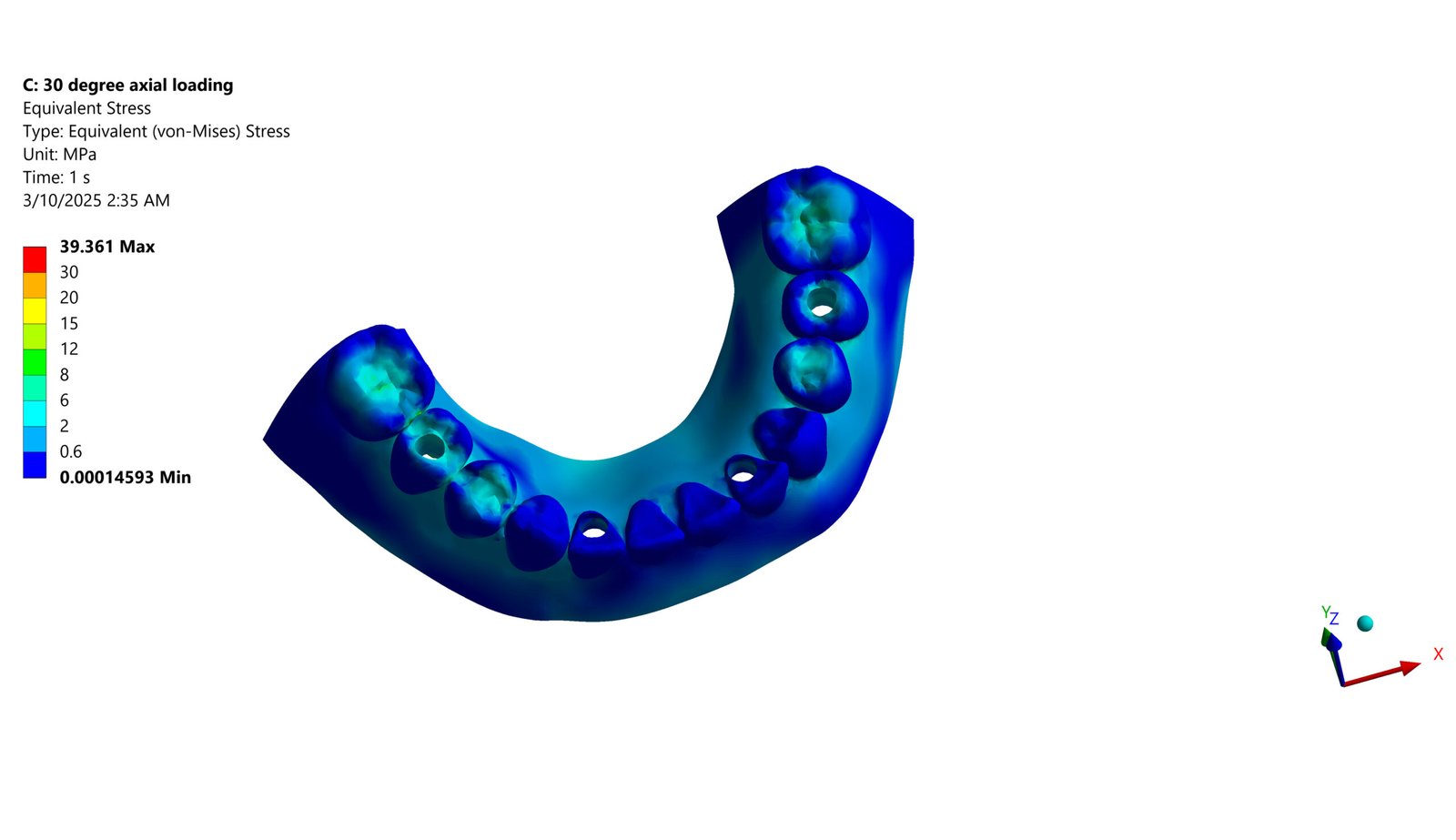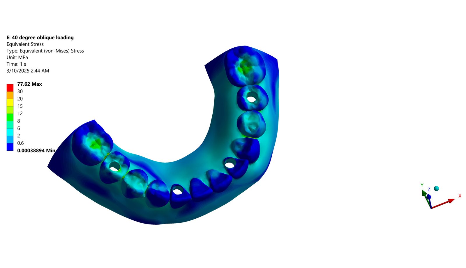 We simulate dental and orthopedic prosthetic systems to analyze stress distribution, fatigue life, and wear behavior. These studies optimize prosthetic design for durability, stability, and patient comfort, supporting clinicians and manufacturers in developing safer and more efficient solutions.